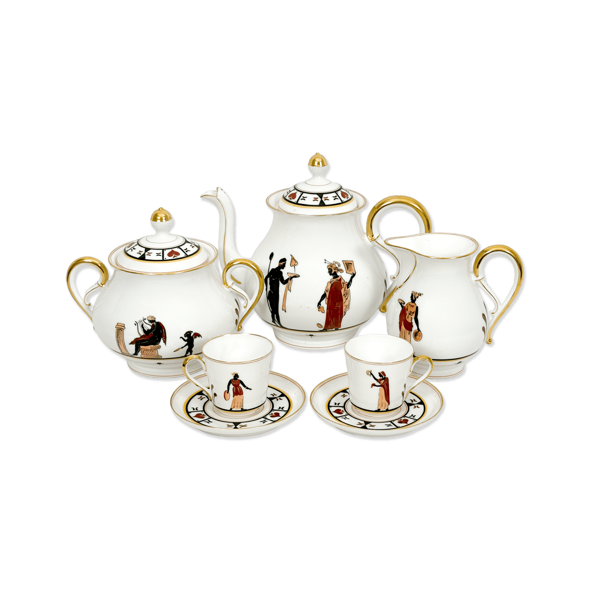 This unusual tea service is decorated in rich polychrome enamels with gilt detailing. The decoration draws inspiration from classical motifs of Ancient Greece and Etruria, giving the set a distinctive and elegant character.