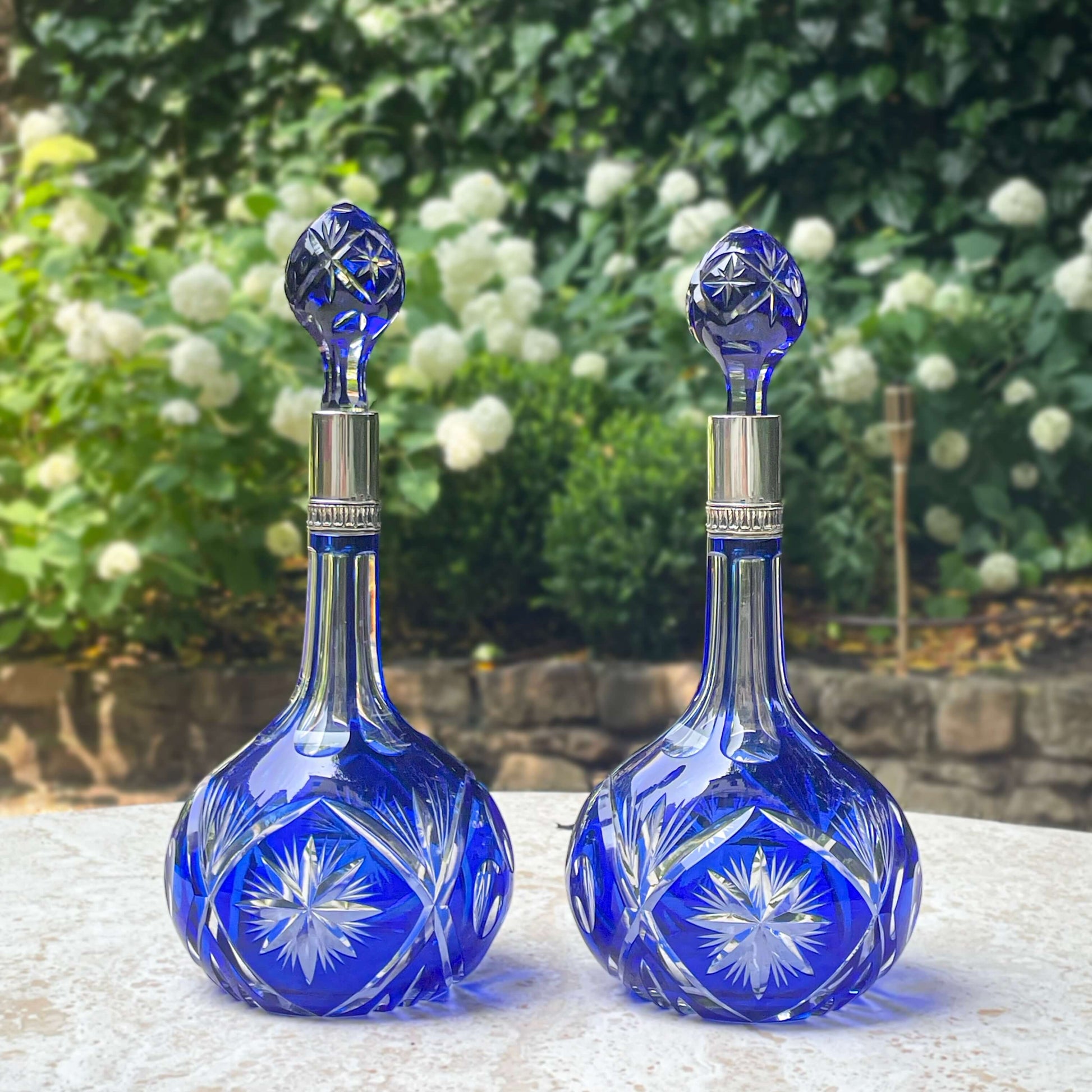 This exquisite pair of handcrafted Bohemian blue crystal bottles brings a perfect touch of elegance and vibrant color to any living space.