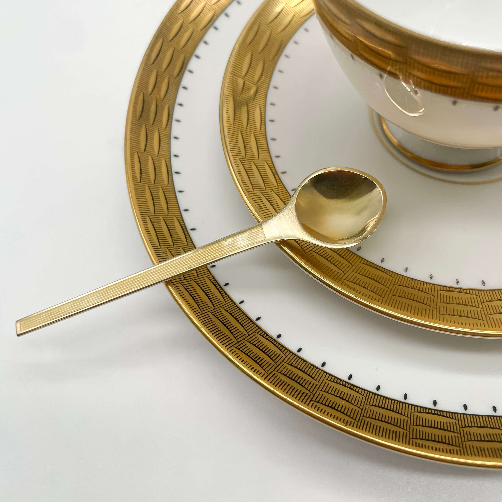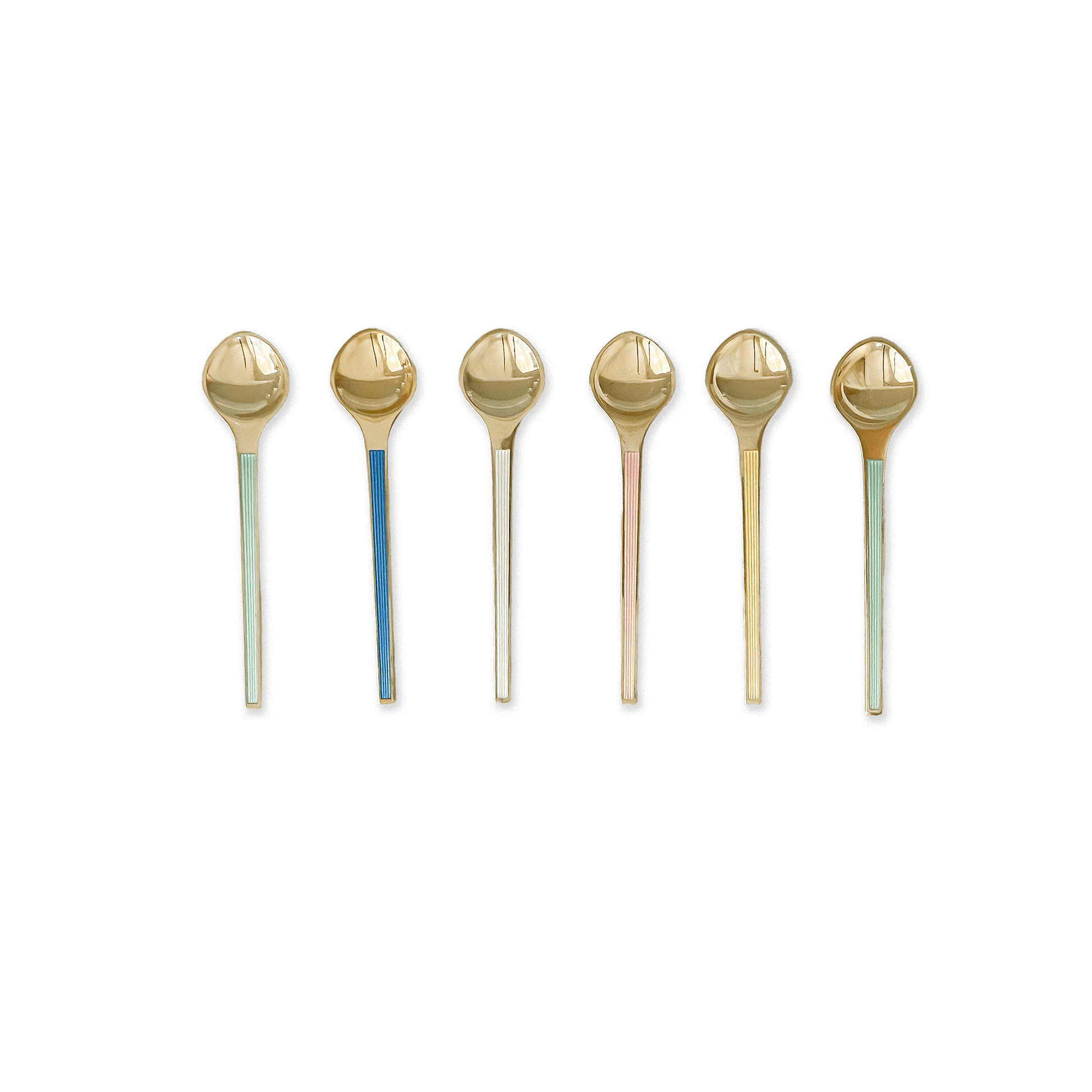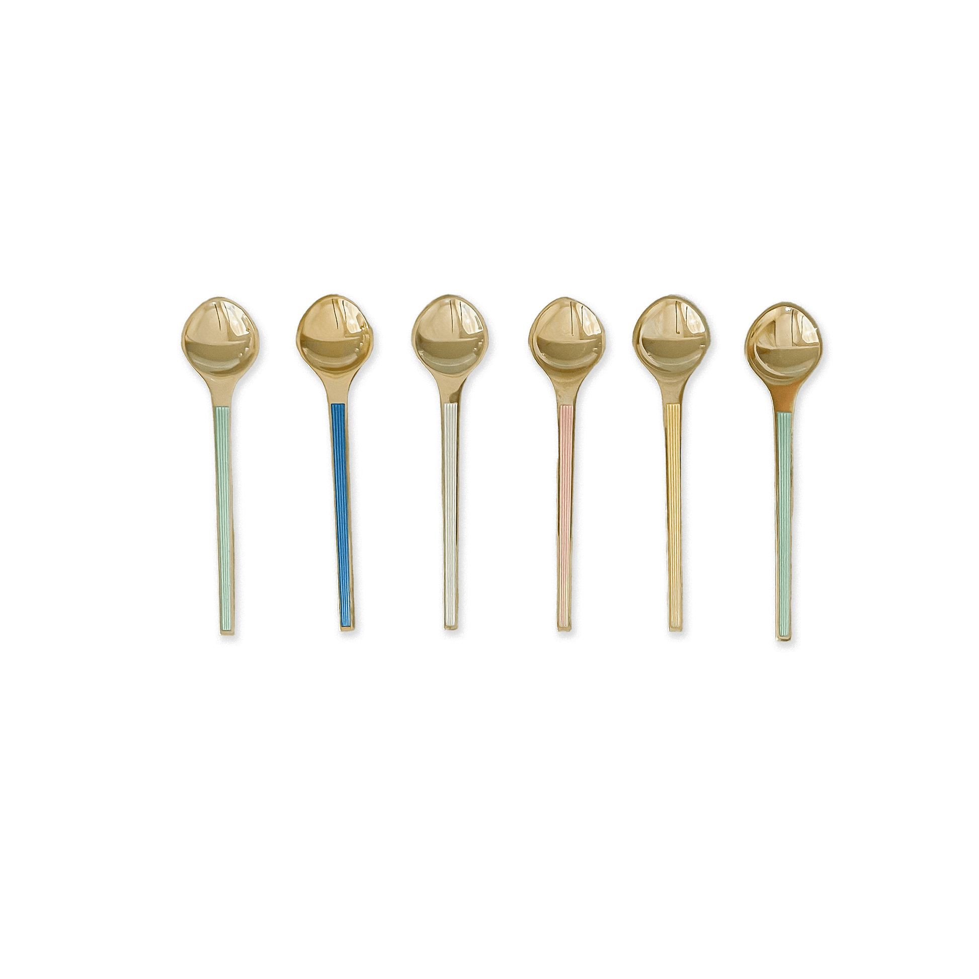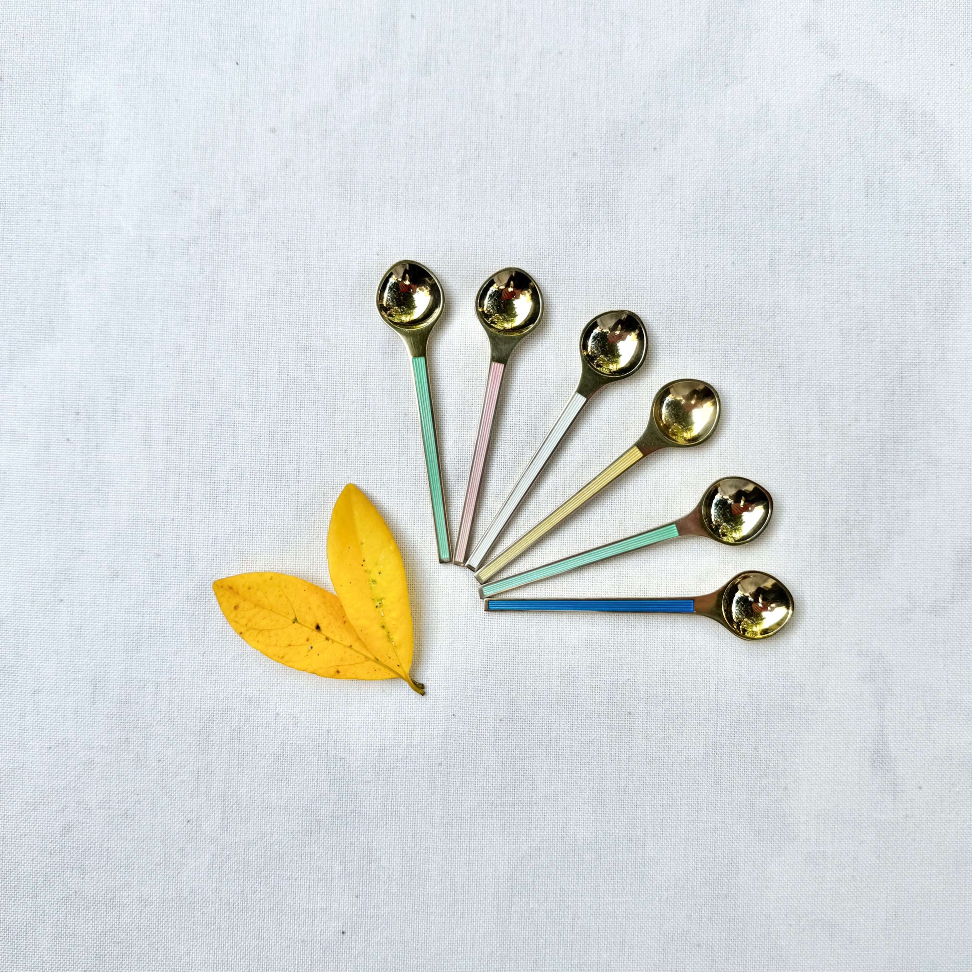 A set of six modern-style Danish spoons with different colors, made in sterling silver and marked for authenticity. Clean, elegant color and lines reflect the classic Scandinavian design of the period.
