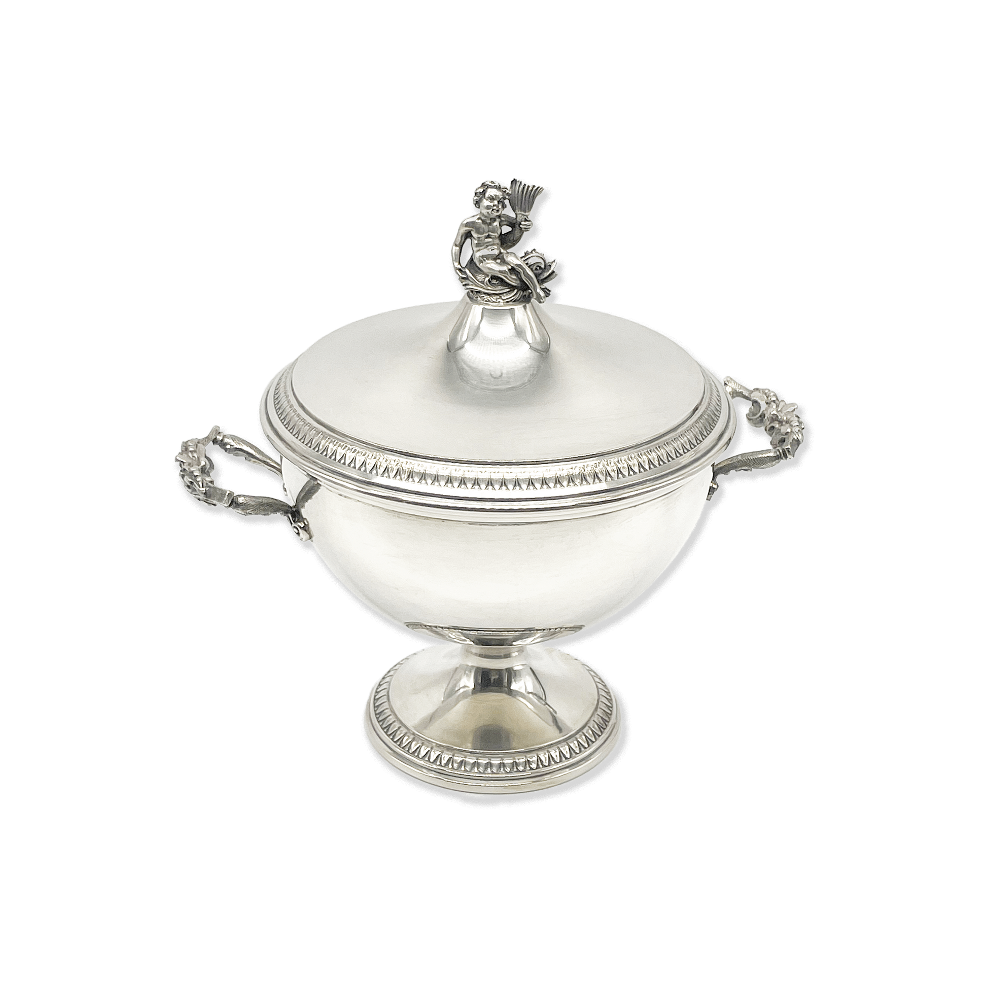 A 20th-century Italian silver sugar bowl with a lid decorated with classical Putti and Fish, demonstrating elegant craftsmanship.