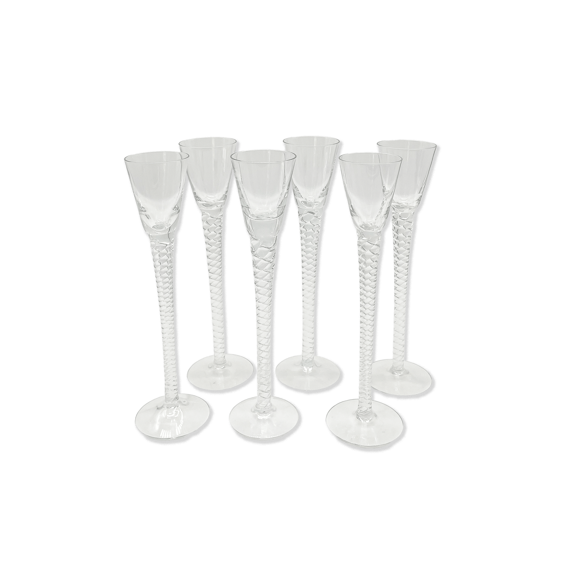 A set of six vintage shot glasses by Holmegaard, Denmark’s renowned glassworks. Each glass features the signature twist stem design — a sculptural detail that combines elegance with a touch of modernist flair. The slender proportions and delicate craftsmanship highlight Holmegaard’s tradition of merging functionality with refined aesthetics.